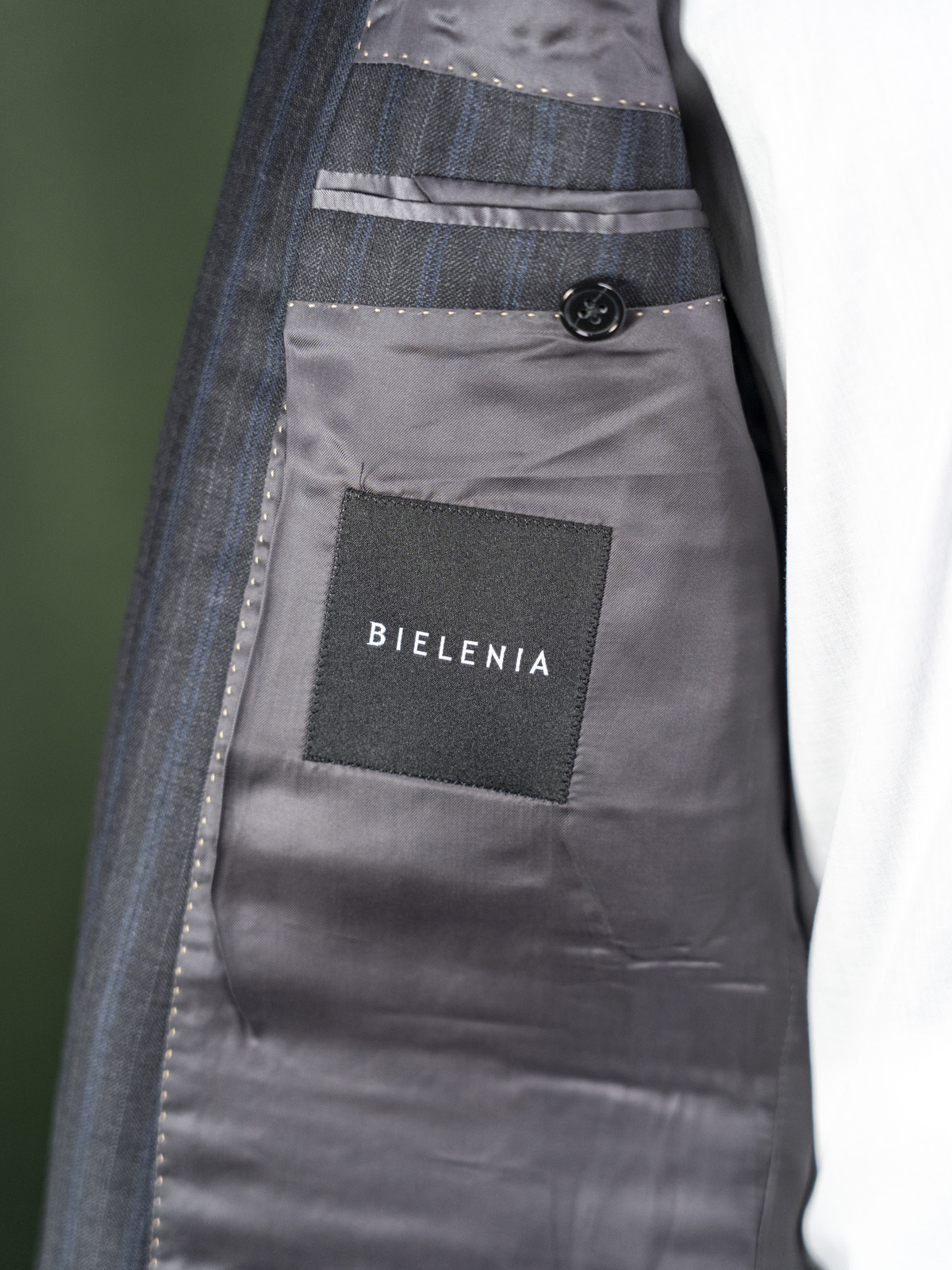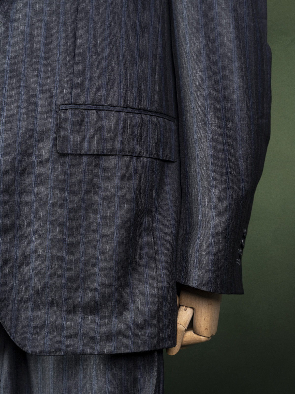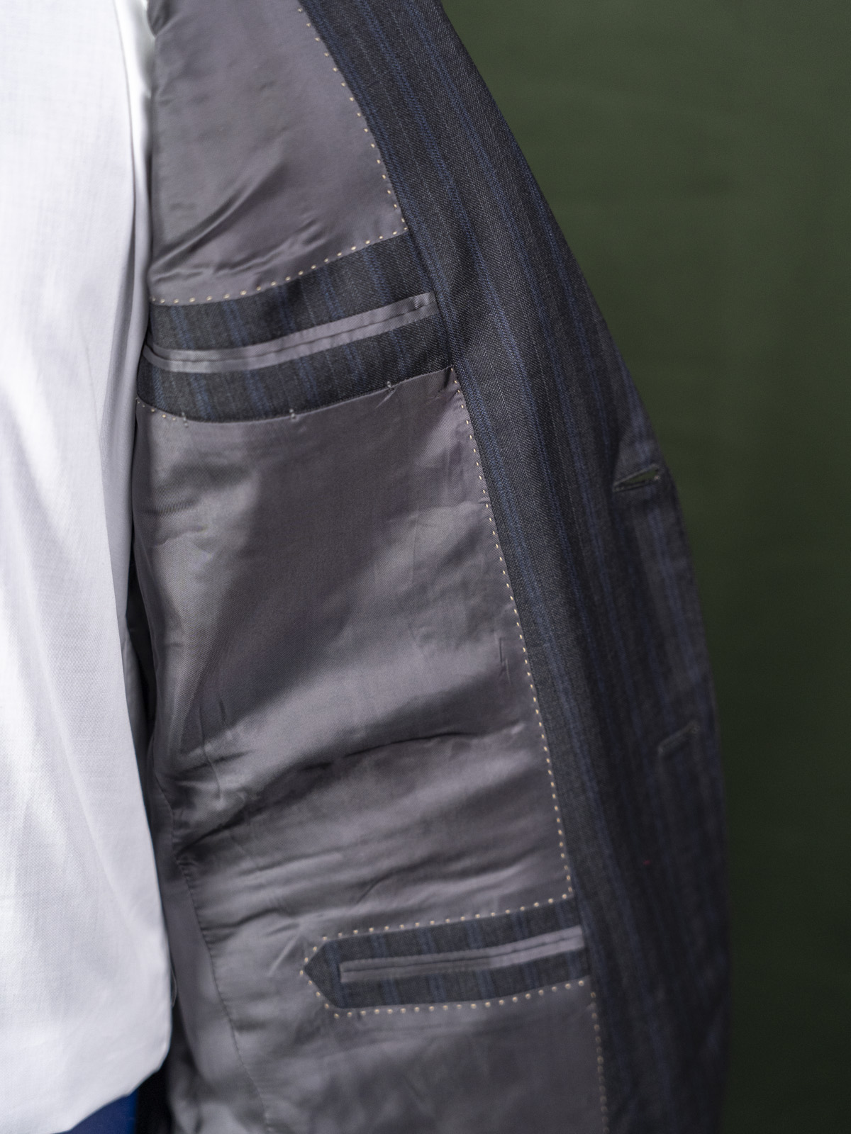 Bielenia ciemnoszary garnitur w granatowe paski r. 56 long