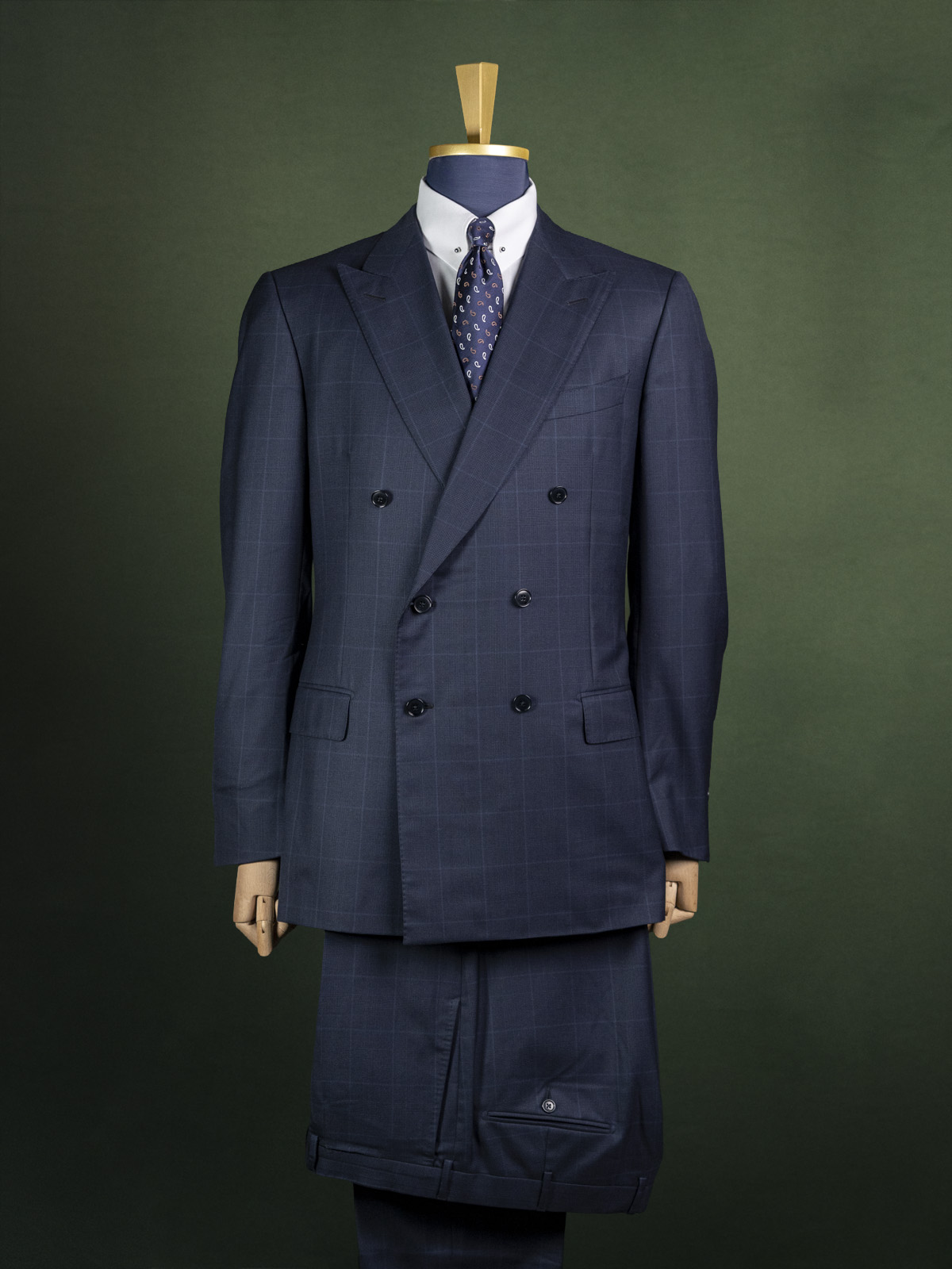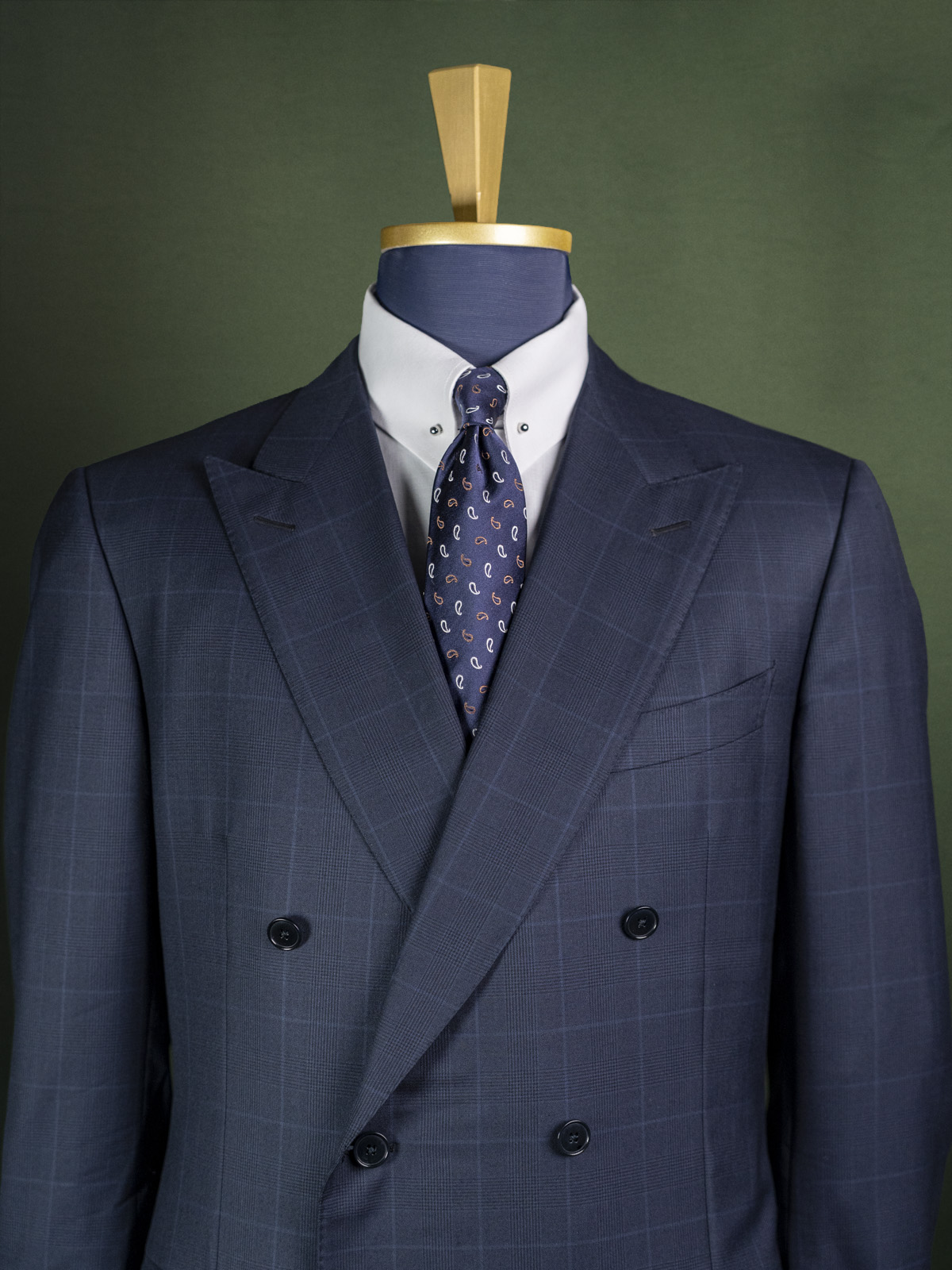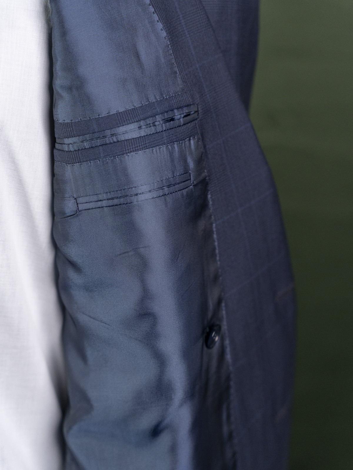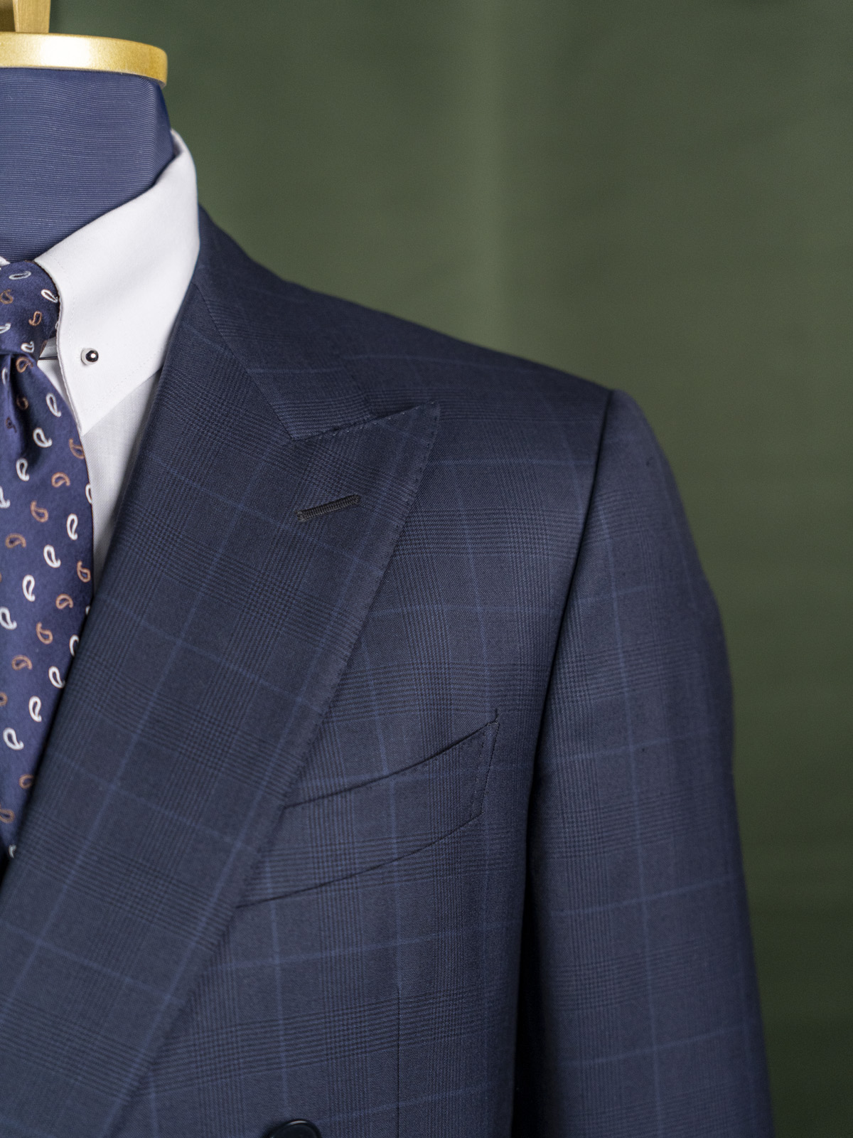 Ten garnitur wełniany to świetny przykład podstawy męskiej szafy. Posiada wszystko, czego potrzeba, w tym solidną, szeroką klapę i tradycyjny krój. Jest on jednak podkręcony ciekawymi detalami w postaci dwurzędowego zapięcia, brustaszy ciętej po łuku (tzw. barchetta), mankietów w nogawkach. Wszystko to sprawia, że garnitur jest jednocześnie klasycznym i wszechstronnym wyborem, jak i przykładem indywidualnego podejścia do mody z nieoczywistymi rozwiązaniami. Wykorzystany materiał to wełna z domieszką jedwabiu, naturalna, oddychająca tkanina zachowująca kompromis pomiędzy trwałością i szlachetnością.