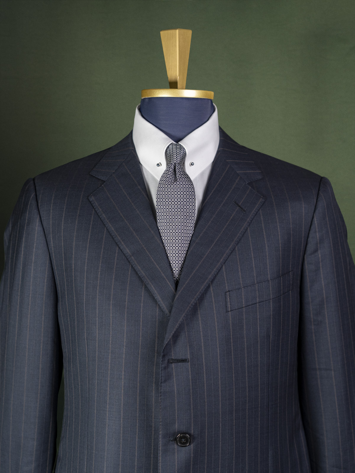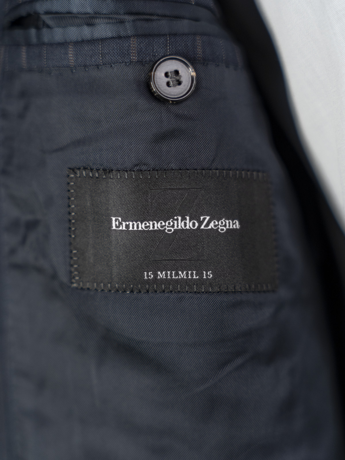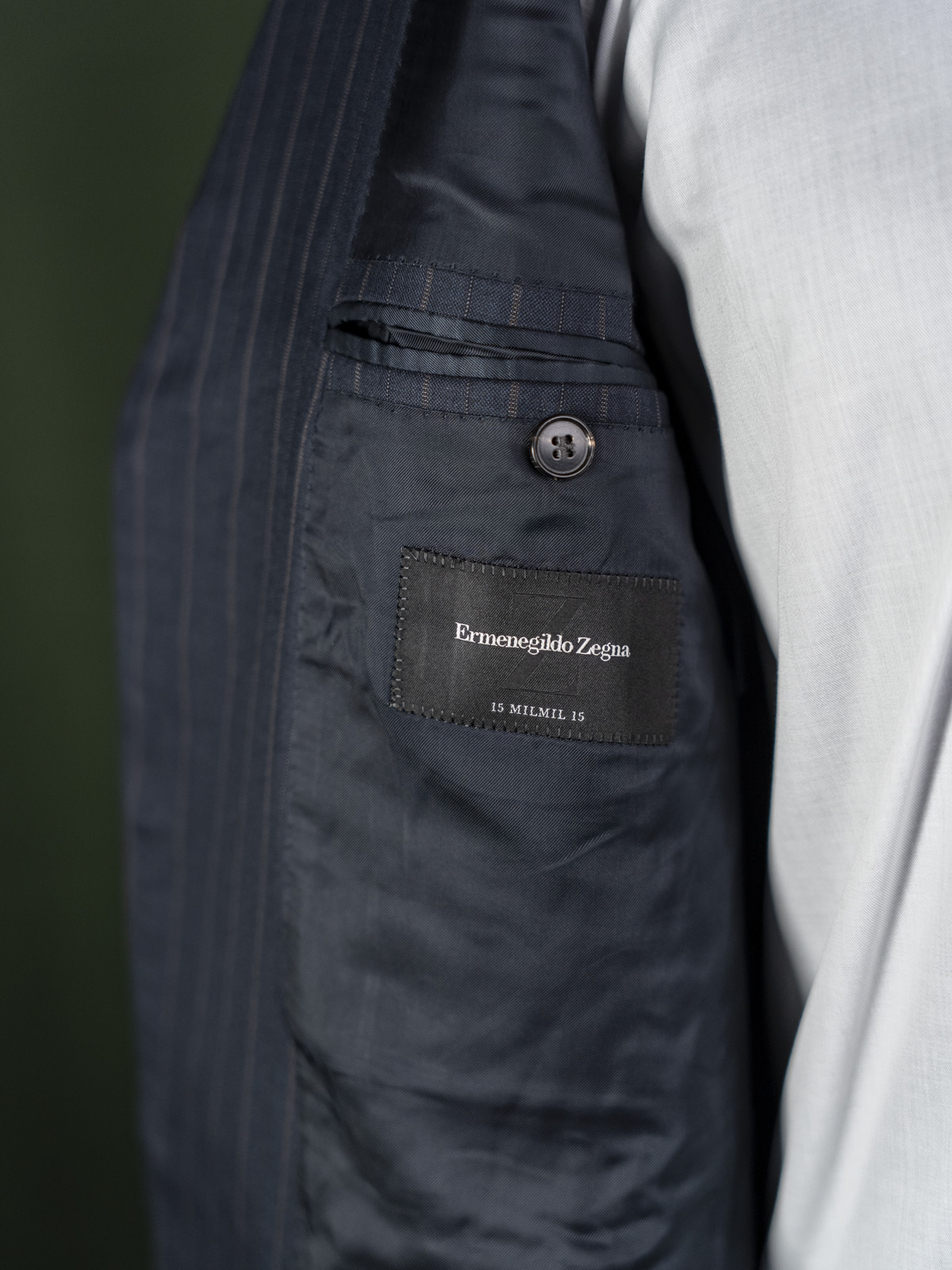 Ermenegildo Zegna granatowy garnitur męski na trzy guziki w brązowy prążek r. 56 long