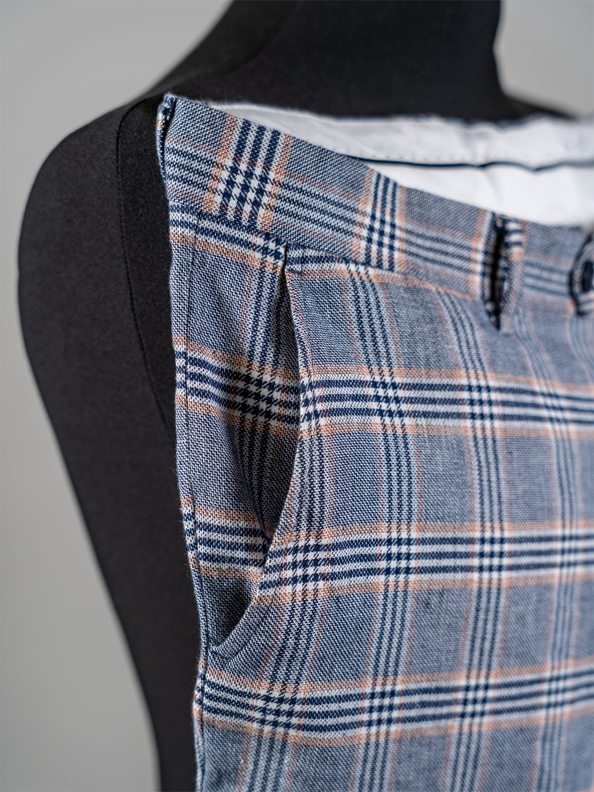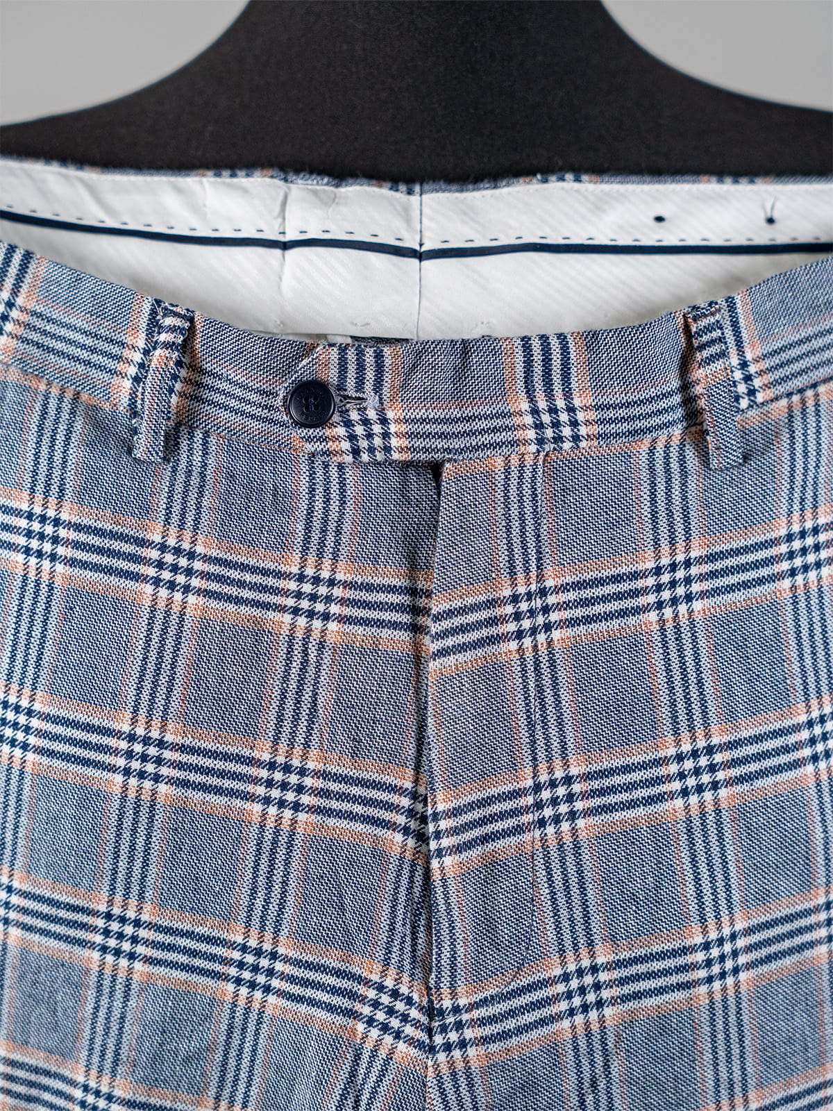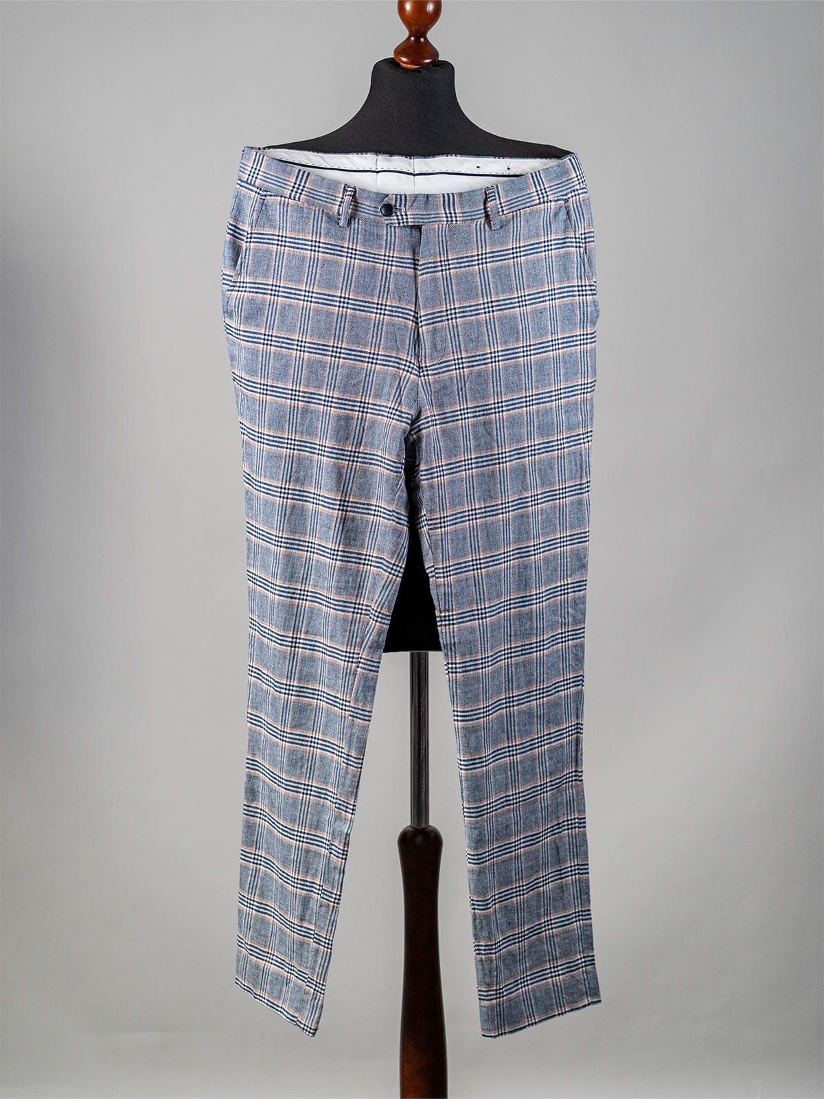 Feraud Błękitne bawełniano-lniane męskie spodnie chino w kratkę POW r. 34/32