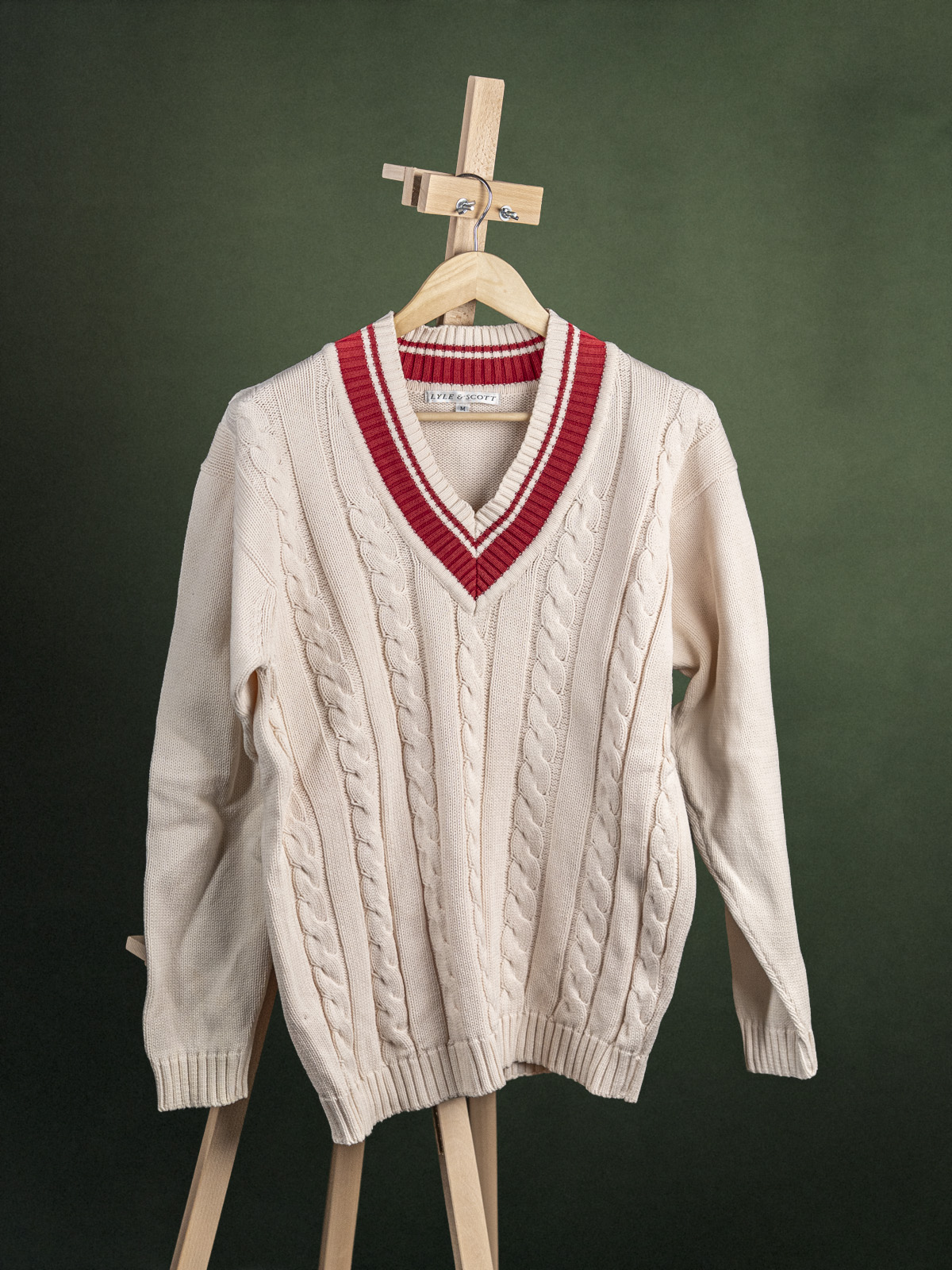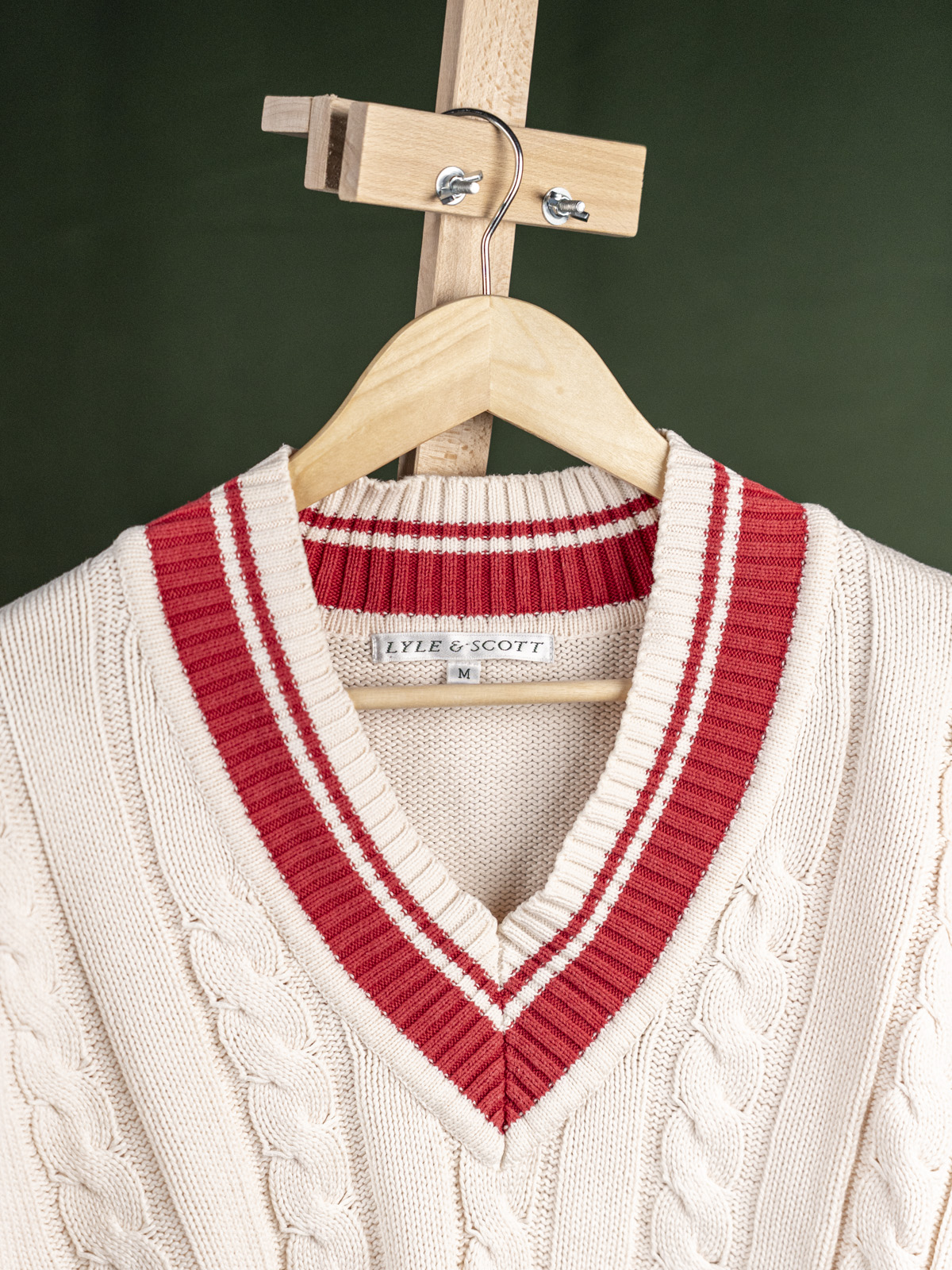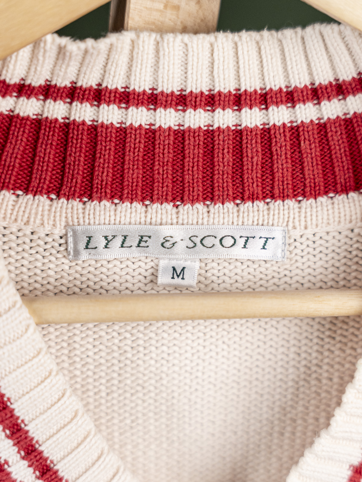 Lyle & Scott kremowy sweter krykietowy męski z czerwonymi akcentami r. M