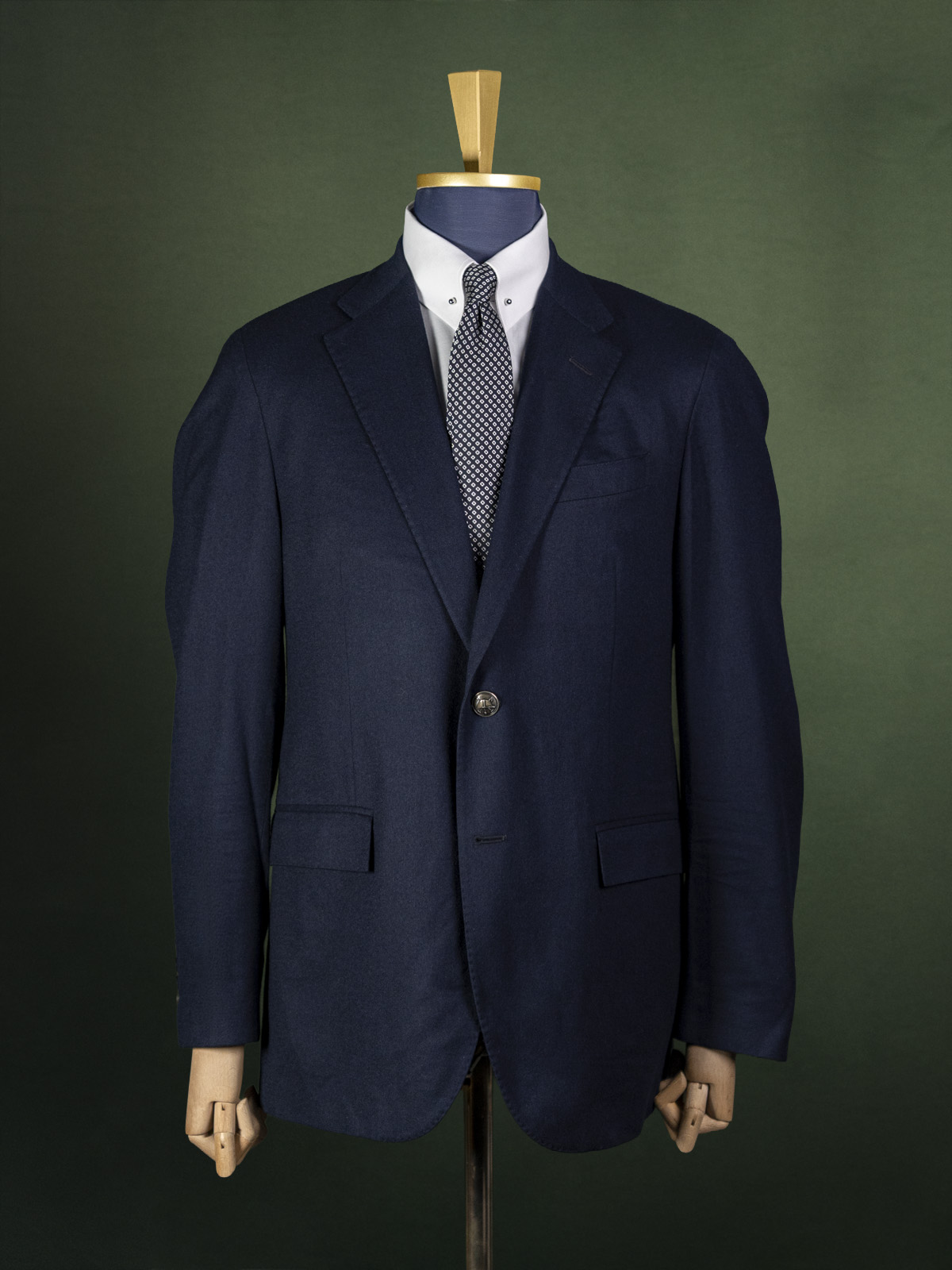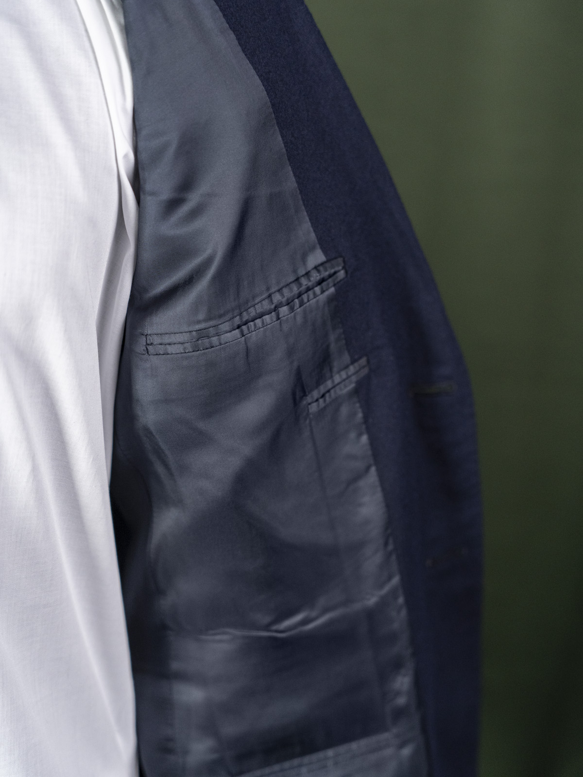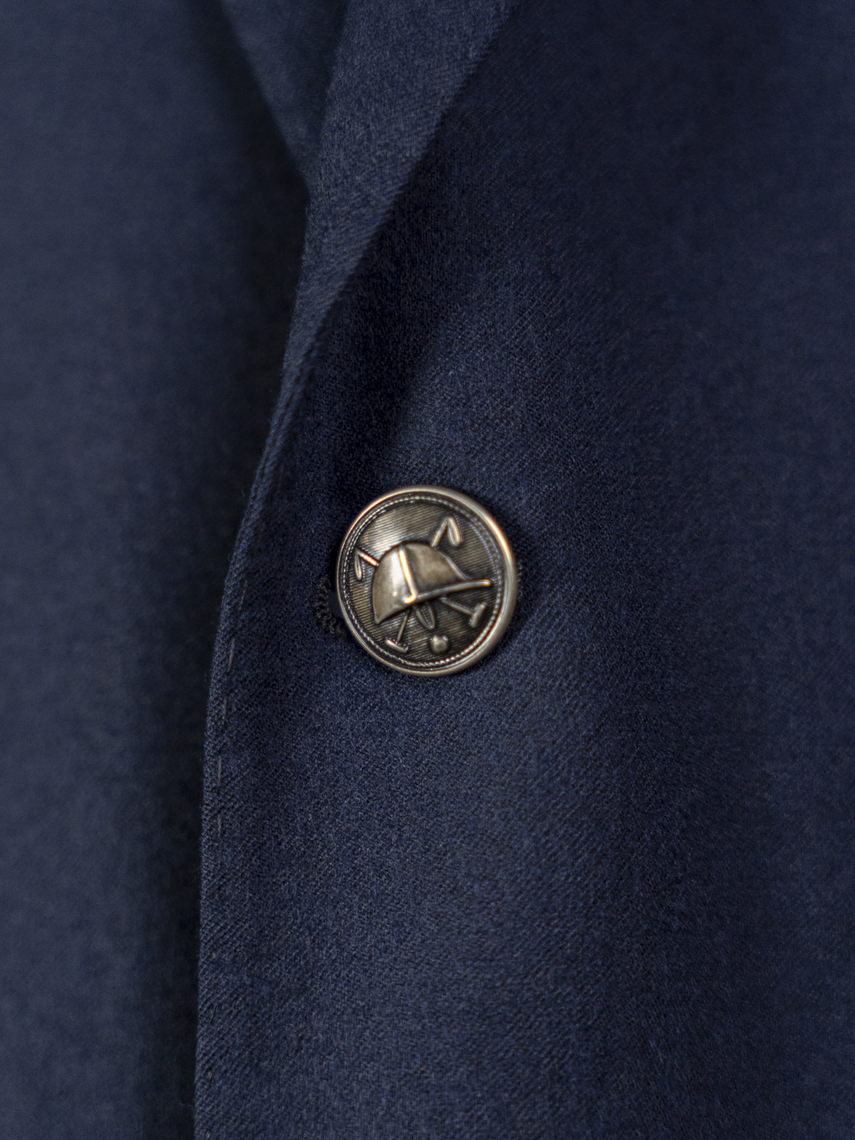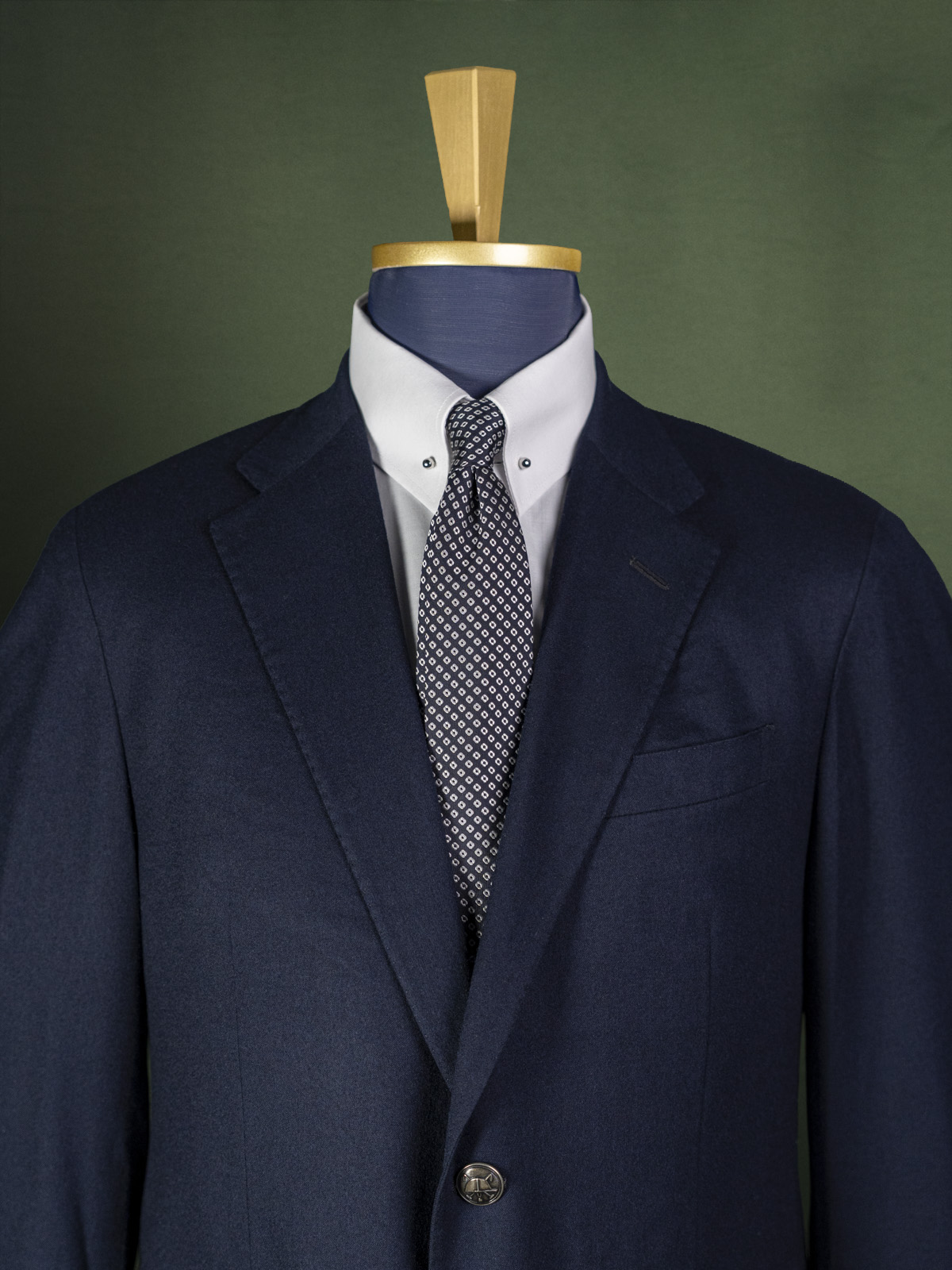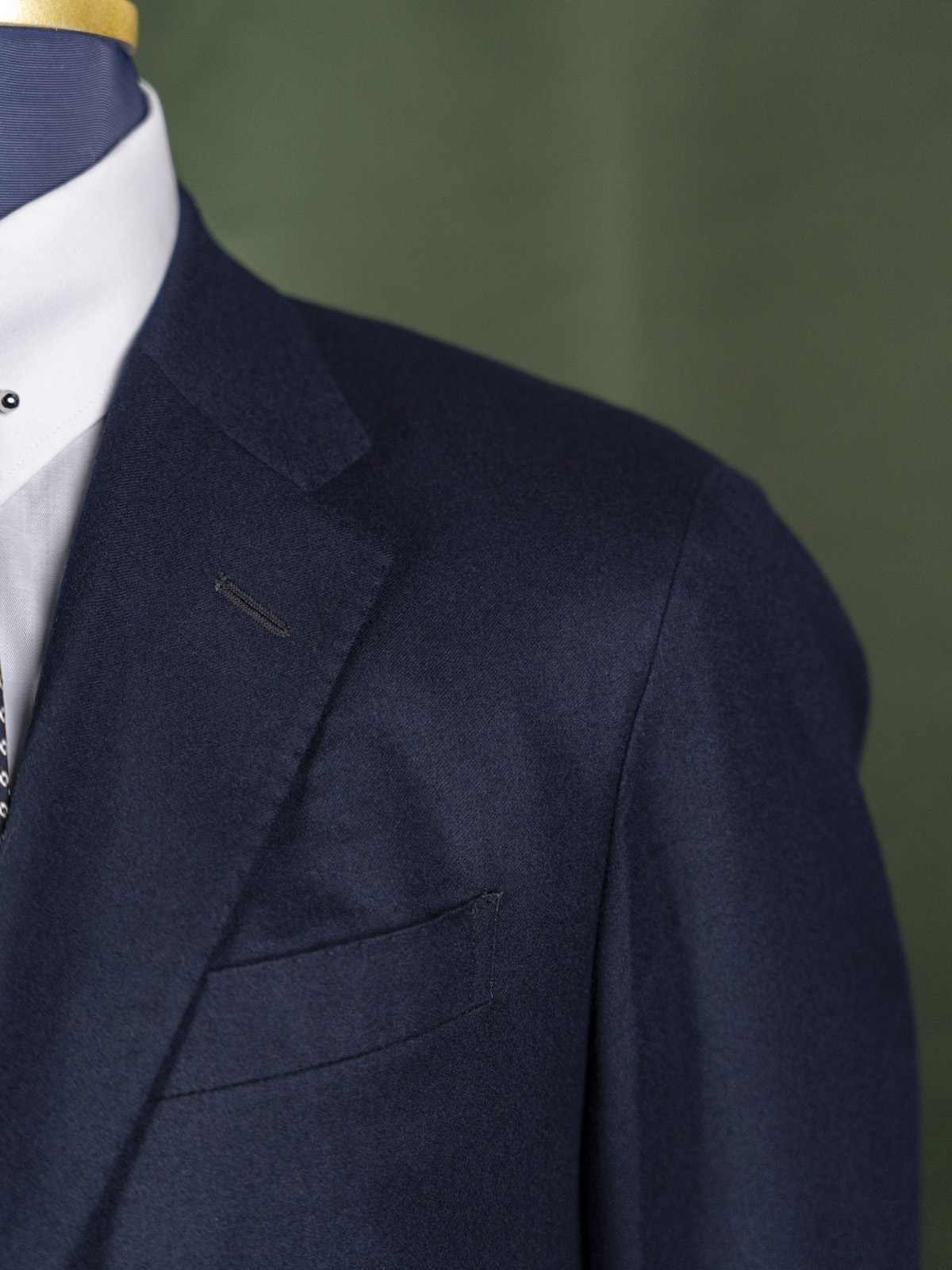 Ten garnitur to wyjątkowo przystojny przykład najbardziej uniwersalnego zestawu. Flanelowa tkanina wełniana to charakterna opcja o typowej, wyraźnej strukturze, nieco mniej formalna niż gładka wełna wysokoskrętna. Garnitur posiada solidne, szerokie klapy dobrze podkreślające sylwetkę, oraz metalowe guziki, co stanowi wyjątkowy detal. Całość tworzy klasyczny i uniwersalny wybór, lecz z indywidualnym, charakternym sznytem.