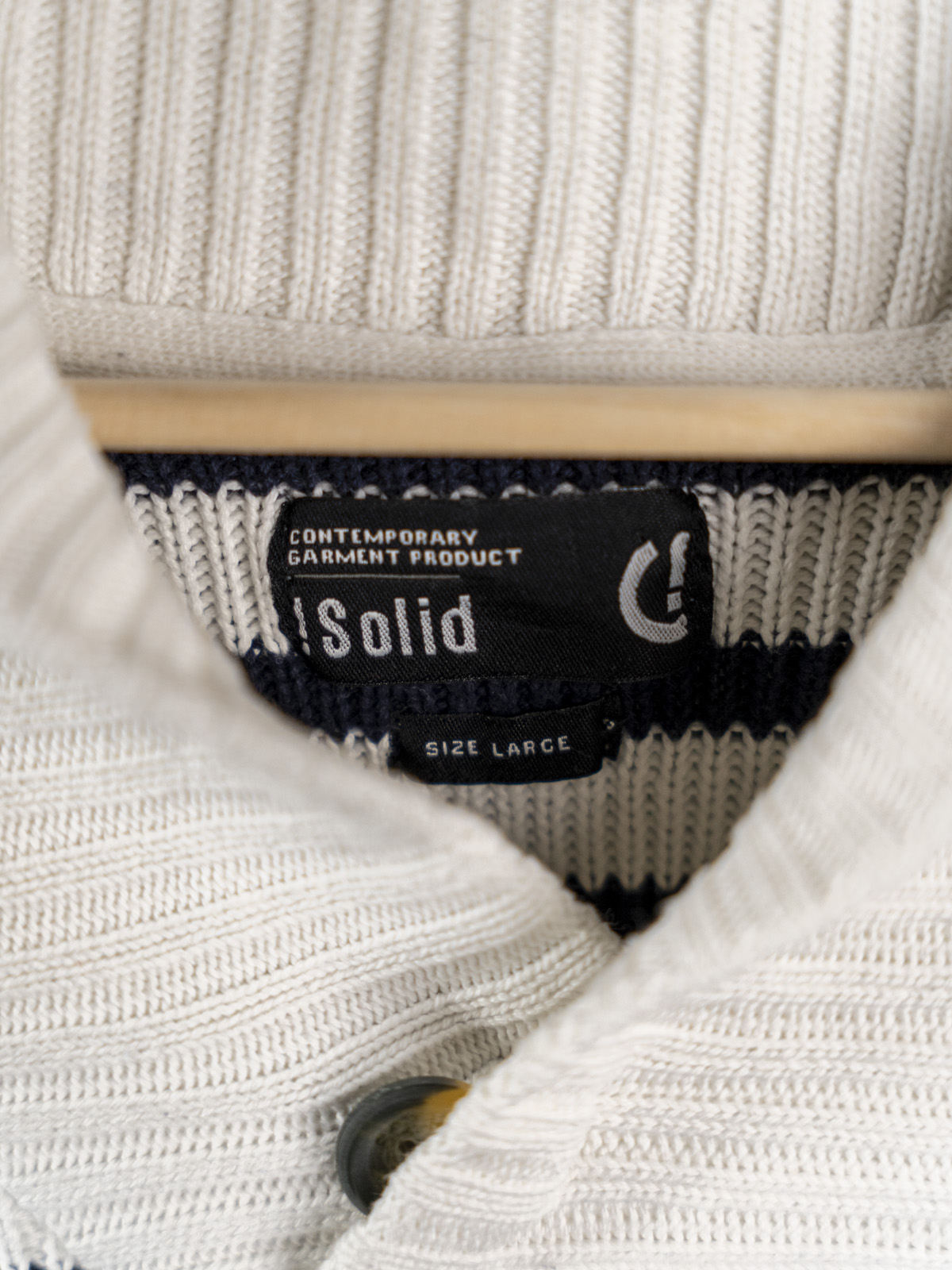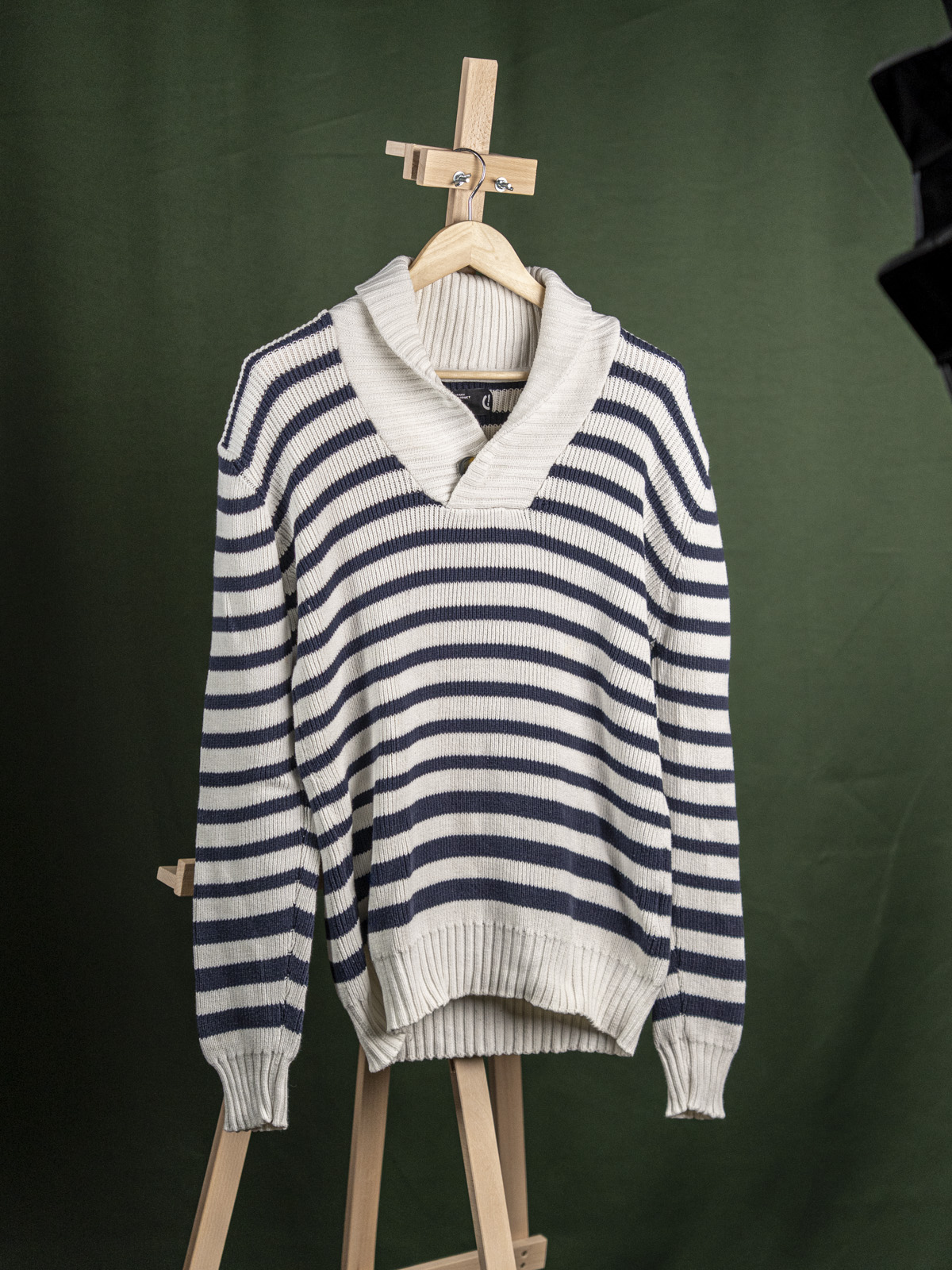 Solid biały sweter męski z kołnierzem szalowym w poprzeczne granatowe pasy r. L