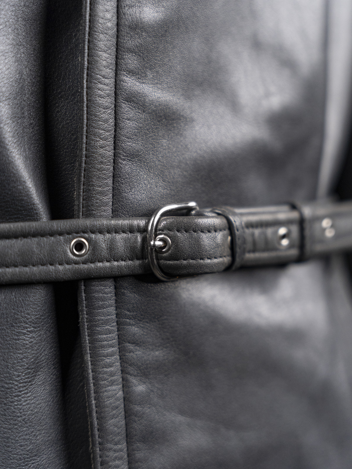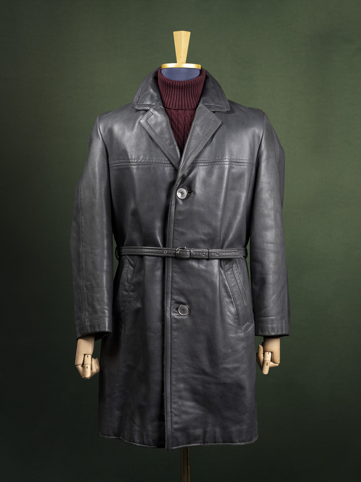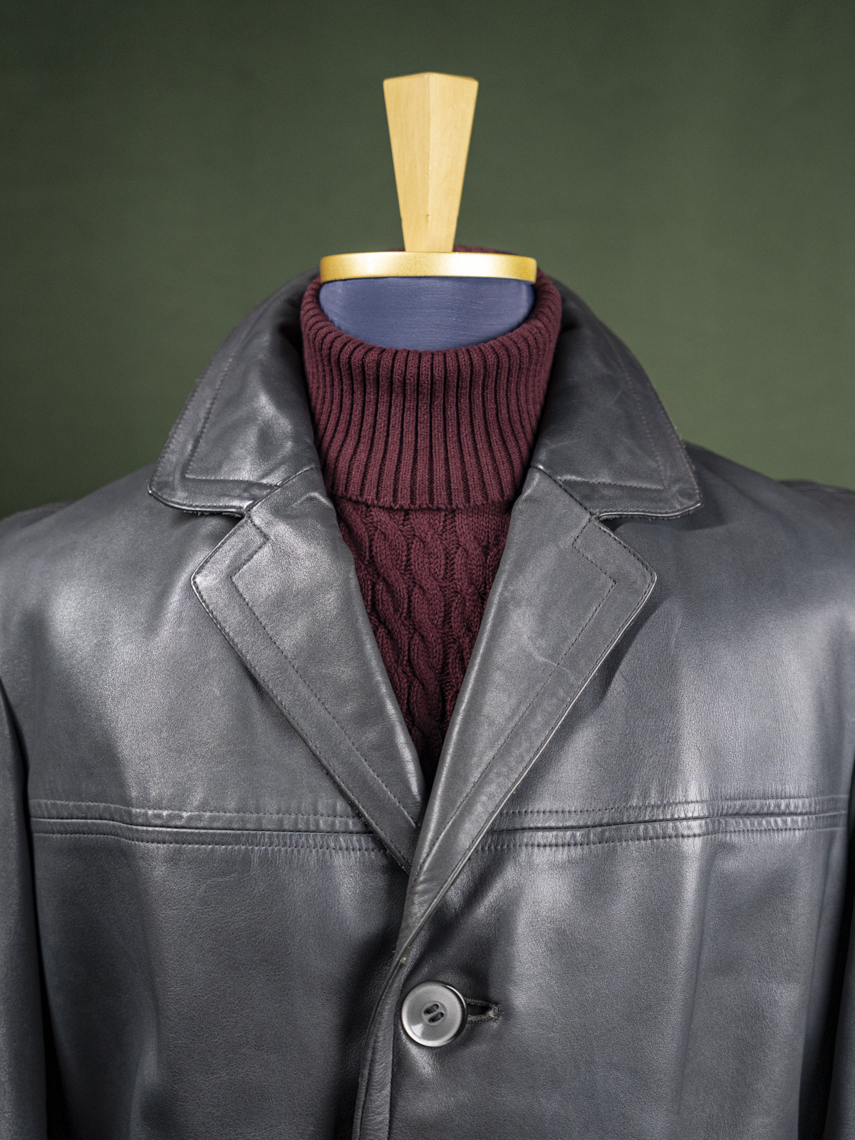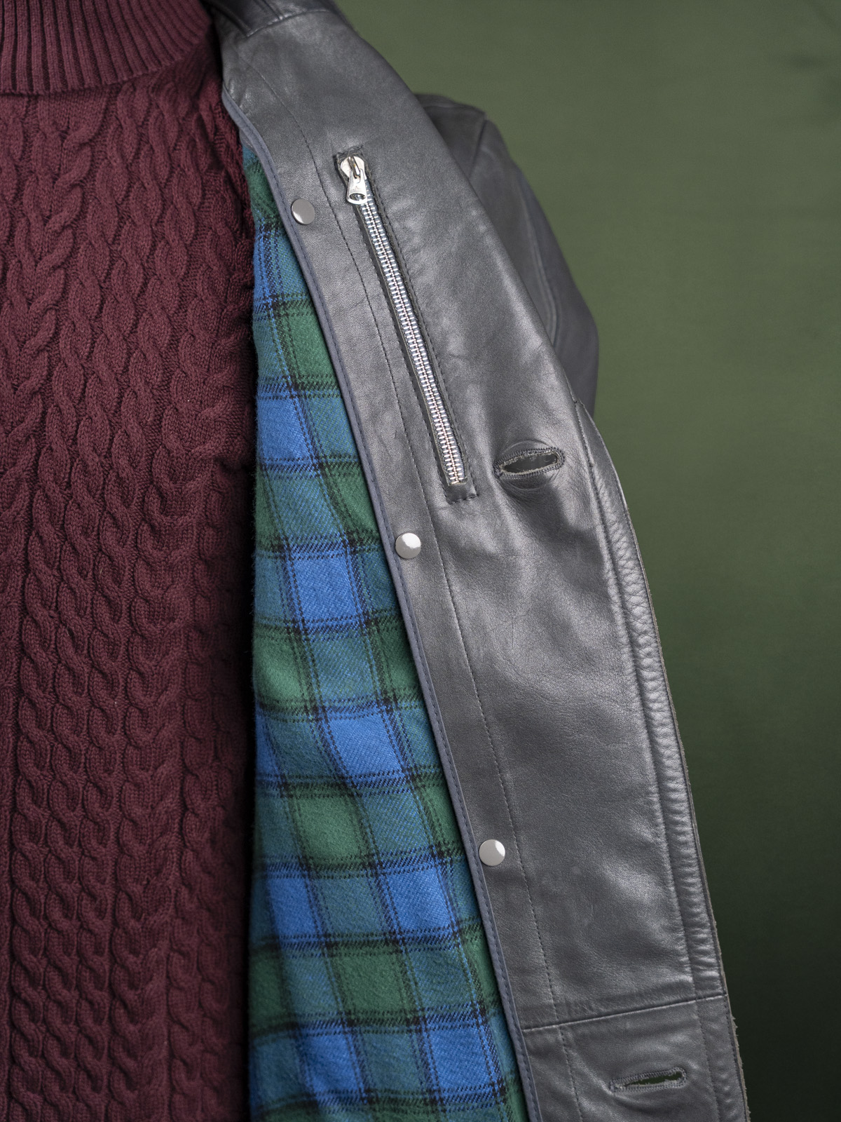 Szary męski płaszcz skórzany z tartanową odpinaną podszewką r. L